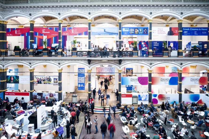 Αυτό το «άλλο φεστιβάλ» είναι η Αγορά (ο επίσημος τίτλος της είναι European Film Market), η οποία φέτος έσπασε κάθε προηγούμενο ρεκόρ με 11.500 διαπιστευμένους από 132 χώρες. Το τεράστιο και εντυπωσιακό κτήριο Martin Gropius Bau, όπου χτυπάει η καρδιά της Αγοράς, είναι γεμάτο με εθνικά περίπτερα και περίπτερα εταιρειών παραγωγής, μεγάλων τηλεοπτικών δικτύων και πλατφορμών. Εκεί γίνονται όλες οι συναντήσεις και μοιάζει περισσότερο με την «κουζίνα» του φεστιβάλ.