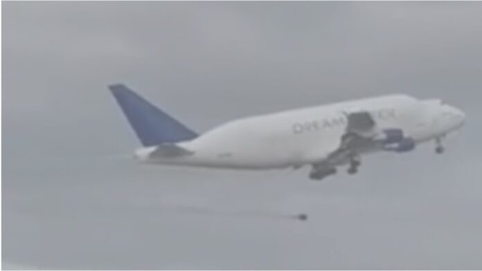 Το βίντεο, που έχει κάνει τον γύρο του διαδικτύου, δείχνει τη στιγμή που ένα τεράστιο Boeing 747 Dreamlifter απογειώνεται και χάνει τον ένα από τους 18 τροχούς του αεροσκάφους, ο οποίος έπιασε φωτιά τη στιγμή της αποκόλλησης.
