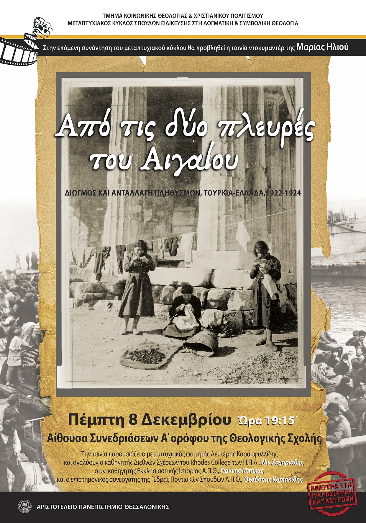 Το ντοκιμαντέρ της Μαρίας Ηλιού, με τίτλο «Από τις δύο πλευρές του Αιγαίου: Διωγμός και ανταλλαγή πληθυσμών, Ελλάδα-Τουρκία, 1922-1924» (2013), θα προβάλει αύριο, Πέμπτη 8 Δεκεμβρίου, στις 19.15, η Κινηματογραφική Λέσχη του Τμήματος Κοινωνικής Θεολογίας και Χριστιανικού Πολιτισμού του ΑΠΘ, συμμετέχοντας στις εκδηλώσεις μνήμης για τη Μικρασιατική Καταστροφή.