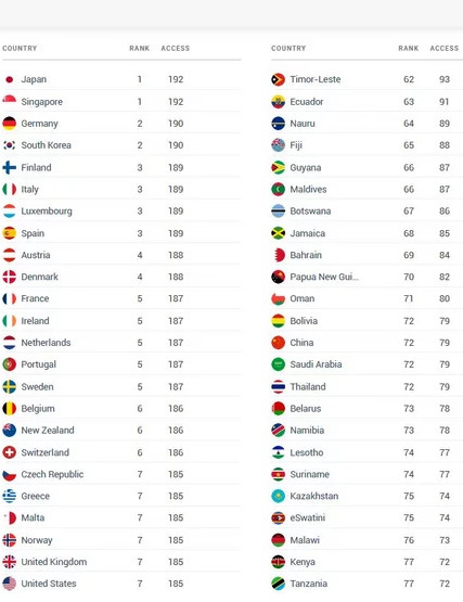 Η Ιαπωνία συνεχίζει να είναι στην πρώτη θέση, την οποία μοιράζεται με την Σιγκαπούρη. Έχουν το πιο ισχυρό διαβατήριο στον κόσμο, με πρόσβαση χωρίς βίζα σε 192 χώρες.
