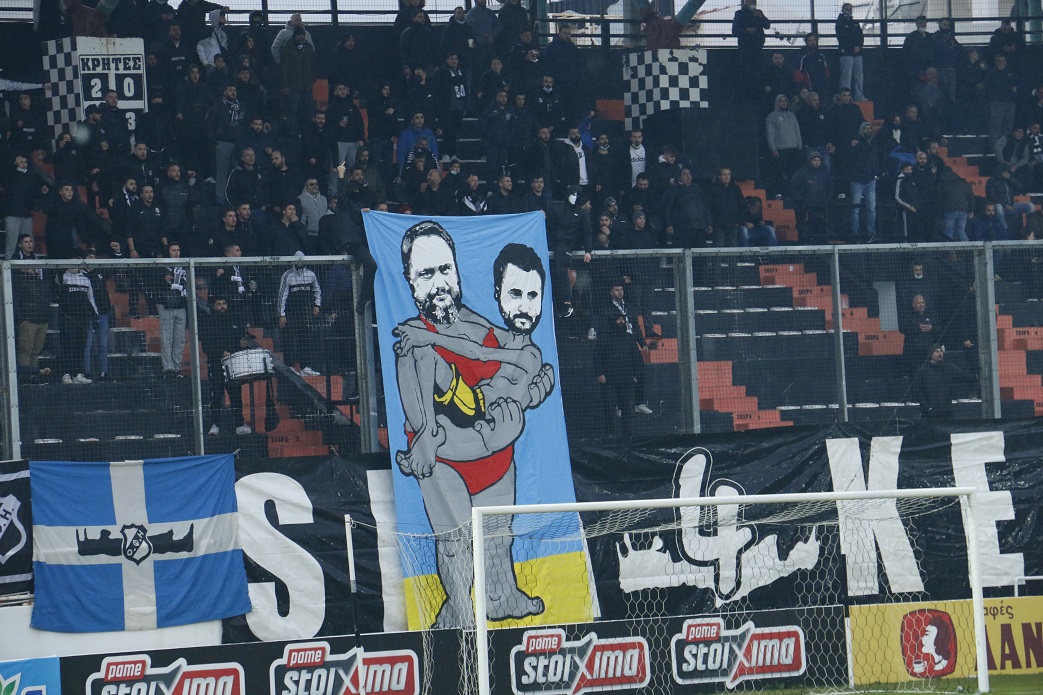 Ένα πανό στο οποίο απεικονίζεται ο Θόδωρος Καρυπίδης στην αγκαλιά του Βαγγέλη Μαρινάκη αναρτήθηκε από τους οπαδούς του ΟΦΗ στο παιχνίδι για το Κύπελλο Ελλάδας που έληξε πριν από λίγη ώρα με νικητές τους κίτρινους.