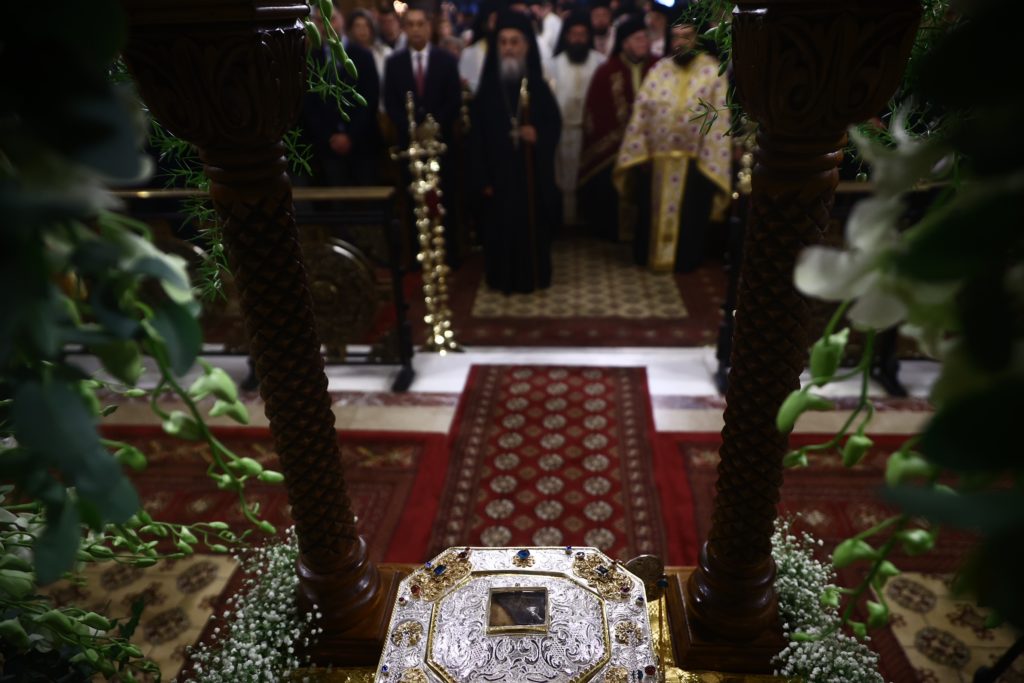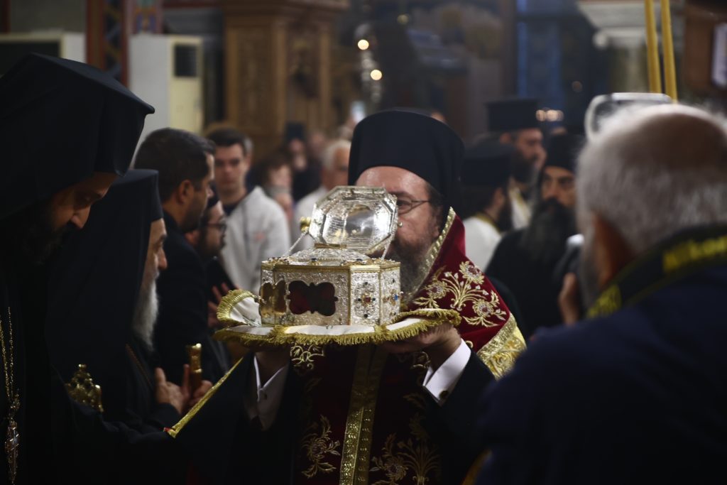 Στη συνέχεια με λιτανευτική πομπή η Τιμία Κάρα κομίστηκε στον Ιερό Μητροπολιτικό Ναό Ζωοδόχου Πηγής Αγρινίου, όπου αυτή την ώρα τελείται Δοξολογία και η Ακολουθία του Εσπερινού, χοροστατούντος του Σεβασμιωτάτου Μητροπολίτου Αιτωλίας και Ακαρνανίας κ. Δαμασκηνού και συμπροσευχομένου του Καθηγούμενου της Ιεράς Μεγίστης Μονής Βατοπαιδίου, Γέροντος Εφραίμ.