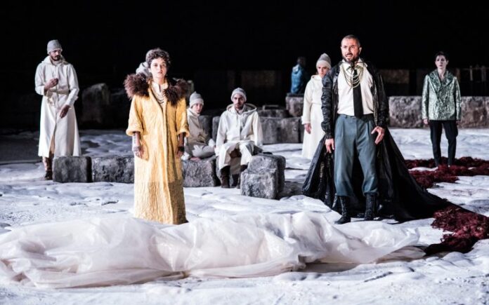Στην «παγωμένη» παράσταση του Αργύρη Ξάφη ρυθμιστικό και καθοριστικό ρόλο παίζει η απόφαση του σκηνοθέτη να απεικονίσει το δεύτερο μέρος του έργου πρώτα και να ολοκληρώσει την παράσταση με το πρώτο. Πόσο δημιουργικά μπορεί να λειτουργήσει μια τόσο σημαντική παρέμβαση σε ένα έργο πλήρες, ολοκληρωμένο και συμπαγές; Συνιστά ολοκληρωμένη σύλληψη και πρόταση μια τόσο δραματική απόφαση και επέμβαση στην πρώτο από τα σωζόμενα έργα του Σοφοκλή; Υπάρχουν αρκετά ευρήματα στην παράσταση που έχουν ενδιαφέρον, αλλά τα πάντα μετριούνται, ζυγίζονται και ορίζονται από την καθοριστική αυτή σύλληψη.