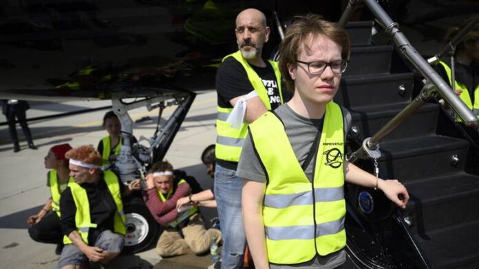 Λίγο νωρίτερα, ακτιβιστές του κλίματος είχαν πραγματοποιήσει παρέμβαση στο σαλόνι επιχειρηματικών τζετ που πραγματοποιείται όχι πολύ μακριά από την πίστα του αεροδρομίου.