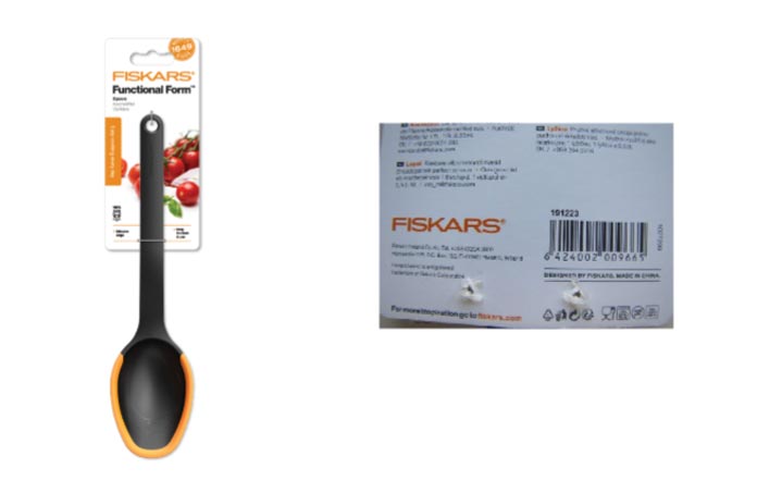 Πρόκειται για πλαστική κουτάλα μαύρου χρώματος, με εμπορική ονομασία “FISKARS”, προέλευσης Κίνας, με κωδικό προϊόντος 1027299 και αριθμό παρτίδας 191223.