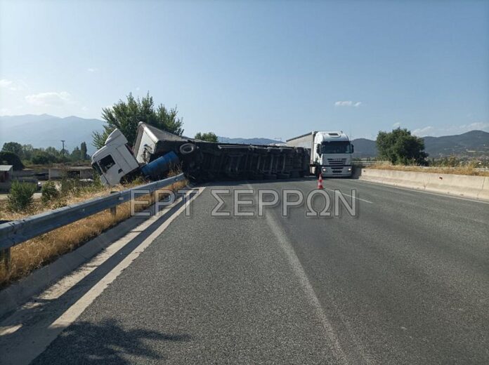 Ανατροπή νταλίκας σημειώθηκε νωρίς το απόγευμα στο Σιδηρόκαστρο Σερρών, επί του κάθετου άξονα του αυτοκινητόδρομου της Εγνατίας Οδού, με συνέπεια η κυκλοφορία στο σημείο να διεξάγεται μετ΄ εμποδίων.