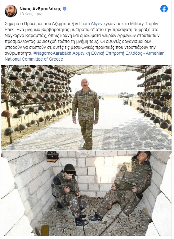 Ο Νίκος Ανδρουλάκης ανέβασε στο facebook εικόνες από το μνημείο βαρβαρότητας που έστησε ο Πρόεδρος του Αζερμπαιτζάν για τη σύρραξη στο Ναγκόρνο Καραμπάχ με τα κράνη των νεκρών Αρμενίων να έχουν τοποθετηθεί ως τρόπαια.