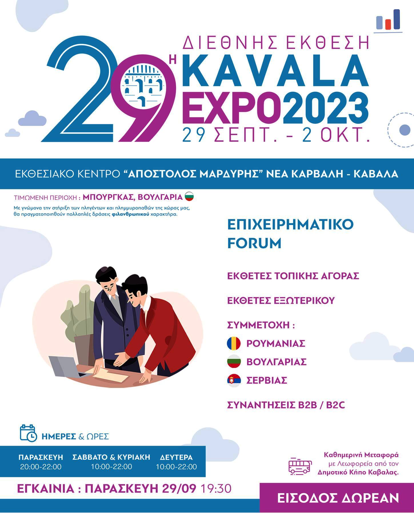 Η 29η Kavala Expo θα διαρκέσει μέχρι την Τρίτη 2 Οκτωβρίου και θα φιλοξενηθεί στο σύγχρονο εκθεσιακό – συνεδριακό κέντρο «Απόστολος Μαρδύρης» στη Νέα Καρβάλη. Στο διάστημα αυτό, τοπικές και διεθνείς επιχειρήσεις θα παρουσιάσουν τα προϊόντα και τις υπηρεσίες τους, όπως επίσης καινοτόμες ιδέες και τεχνολογίες. Παράλληλα, θα υπάρχουν πολλές δράσεις και μουσικές εκδηλώσεις για μικρούς και μεγάλους.