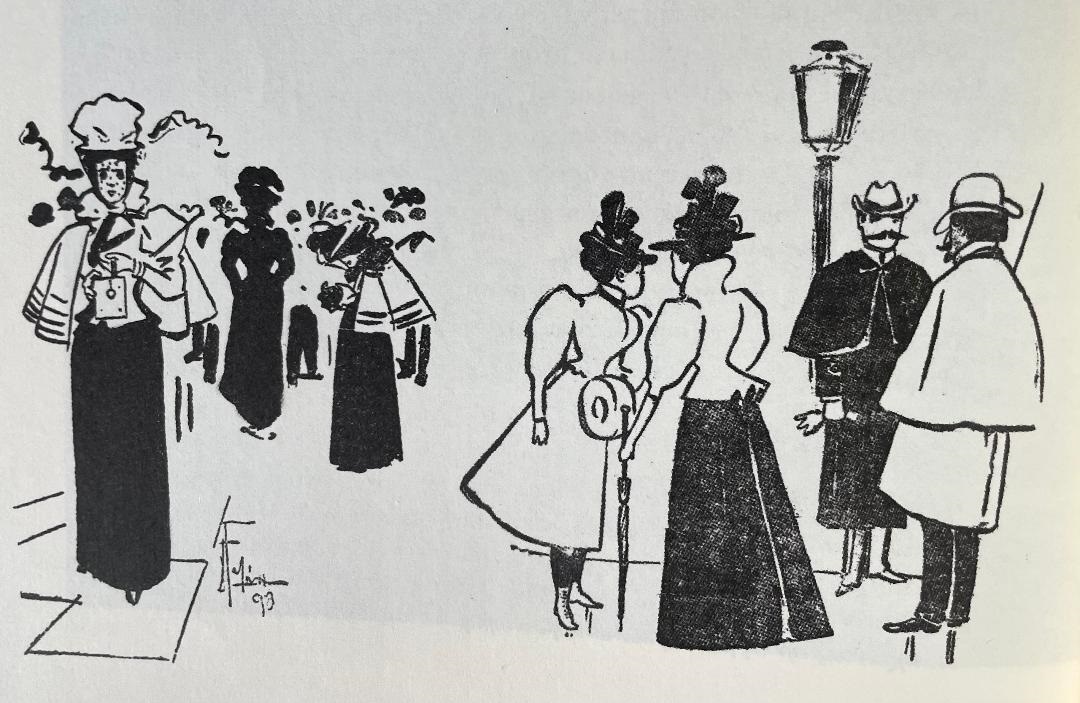 «Το αξιοπερίεργο είναι το εξάρτημα που κρατούν οι κοσμικές, συμπλήρωμα της εκκεντρικής τους κομψότητας, το διάσημο “κουτί” της Kodak, της πρώτης φωτογραφικής μηχανής. Ποιο «σήμα» μετέδιδε άραγε στους ενδιαφερόμενους η μηχανή μόνον οι σημειολόγοι των κοινωνικών φαινομένων θα μπορούσαν να αποφανθούν. Ωστόσο με την σημερινή εμπειρία της πληθώρας των αμέτρητων συσκευών τηλεφωνοφωτογραφικών, το χόμπι, ξεπέρασε τη μόδα, ξέφυγε και πέρασε στα όρια της μανίας. Με μέτρο λοιπόν τη σημερινή πραγματικότητα, μπορούμε πολύ εύκολα να κατανοήσουμε τη συνήθεια των Ατθίδων. Από χρέος στην τέχνη να σημειώσουμε ότι το σκίτσο είναι δια χειρός του χαράκτη Δημήτρη Γαλάνη, που από τότε είχε αρχίζει η φήμη του να ξεπερνά τα όρια του αθηναϊκού ορίζοντα»