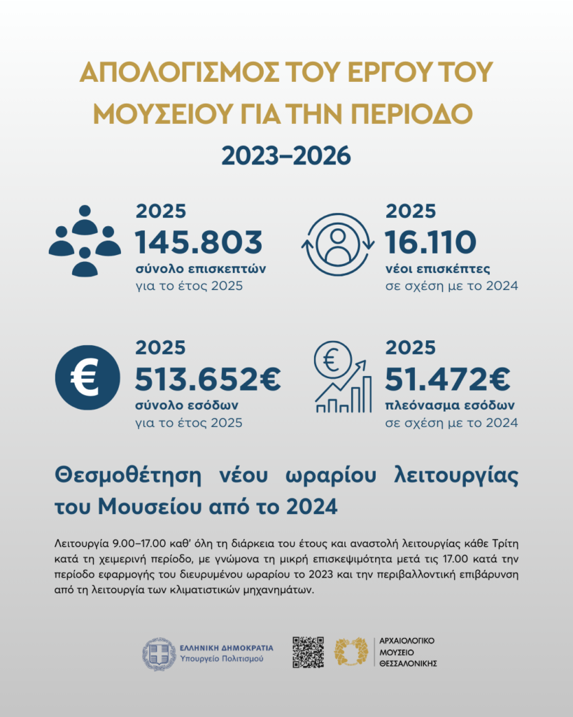 Ο απολογισμός έκλεισε με την προοπτική της επόμενης μέρας, η οποία περιλαμβάνει την ενεργειακή αναβάθμιση του κτιρίου και την ανάπλαση του περιβάλλοντος χώρου, εξασφαλίζοντας ότι το Αρχαιολογικό Μουσείο Θεσσαλονίκης θα παραμείνει ο κορυφαίος πολιτιστικός πόλος της Βόρειας Ελλάδας.