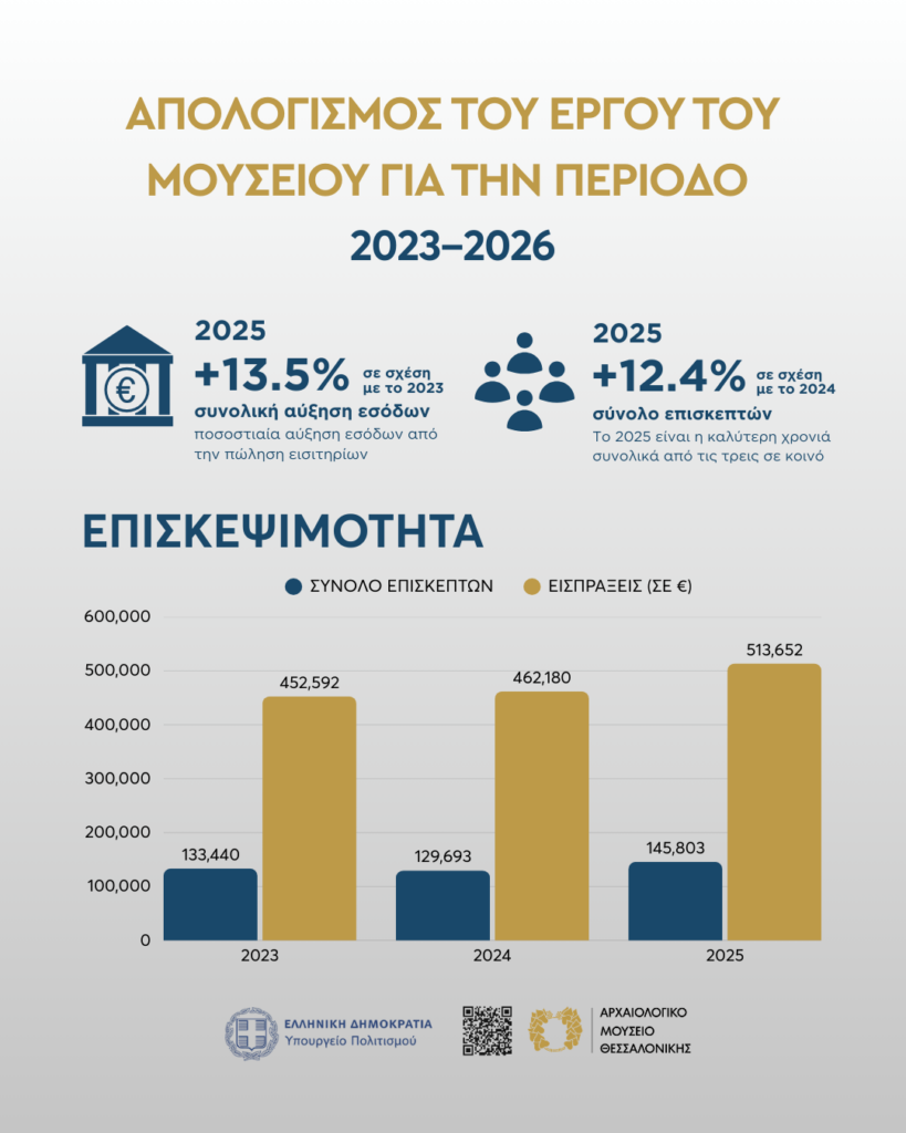 Με την παρουσία της Υπουργού Πολιτισμού, Λίνας Μενδώνη, σφραγίστηκε η ολοκλήρωση μιας κομβικής τριετίας για το Αρχαιολογικό Μουσείο Θεσσαλονίκης (ΑΜΘ). Ο απολογισμός της περιόδου 2023-2026, που παρουσιάστηκε την Τετάρτη 11 Μαρτίου, ανέδειξε πώς η μετάβαση του Μουσείου σε Νομικό Πρόσωπο Δημοσίου Δικαίου (ΝΠΔΔ) λειτούργησε ως επιταχυντής για τον ψηφιακό μετασχηματισμό, τη διεθνή εξωστρέφεια και την οικονομική του αυτοτέλεια, μετατρέποντάς το σε έναν σύγχρονο, πολυδύναμο πολιτιστικό οργανισμό.