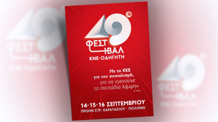 Με σύνθημα «Με το ΚΚΕ για το σοσιαλισμό, “για να γενούνε τα σκοτάδια λάμψη”( Ναζίμ Χικμέτ)» ανοίγει σήμερα τις πύλες του, στο πρώην Στρατόπεδο Καρατάσιου, στην Πολίχνη, το 49ο Φεστιβάλ ΚΝΕ-Οδηγητή το οποίο ολοκληρώνεται το Σάββατο 16 Σεπτεμβρίου, με πολιτική συγκέντρωση με ομιλήτρια τη Θεανώ Καπέτη, μέλος του ΠΓ της ΚΕ του ΚΚΕ.