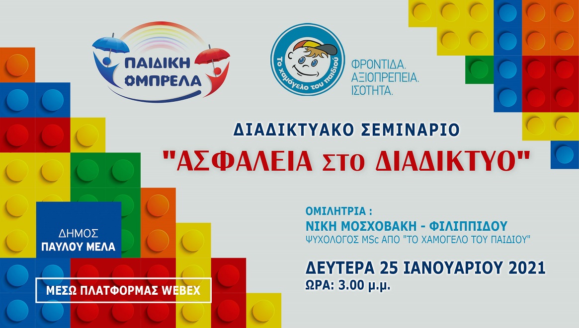 Τη Δευτέρα 25 Ιανουαρίου 2021 και ώρα 15:00 μ.μ., διοργανώνεται διαδικτυακό σεμινάριο με θέμα «Ασφάλεια στο διαδίκτυο», μέσω της πλατφόρμας Webex και η Αντιδήμαρχος Κοινωνικής Πολιτικής Χαρά Αμανατίδου καλεί τους ενδιαφερόμενους, κυρίως γονείς – κηδεμόνες και εκπαιδευτικούς, να στείλουν e-mail με θέμα «Σεμινάριο 250121» στο thesspress@hamogelo.gr για να λάβουν οδηγίες για τη σύνδεση και συμμετοχή στην εξ αποστάσεως δράση του Οργανισμού «Το Χαμόγελο του Παιδιού» και της Δομής Υποστήριξης Παιδιού & Οικογένειας του Δήμου Παύλου Μελά «Παιδική Ομπρέλα».
