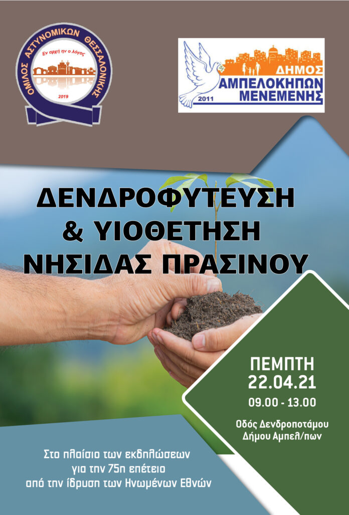 Στο πλαίσιο αυτό, ο Όμιλος Αστυνομικών Θεσσαλονίκης, σε συνεργασία με τον Δήμο Αμπελοκήπων- Μενεμένης θα πραγματοποιήσει μεθαύριο, Πέμπτη 22/4, από τις 09:00 έως τις 13:00, στην οδό Δεντροποτάμου, συμβολική δεντροφύτευση, στο πλαίσιο των εορταστικών εκδηλώσεων για την 75η επέτειο από την ίδρυση των Ηνωμένων Εθνών. Η δράση, ωστόσο, δεν περιορίζεται στη δενδροφύτευση, αφού ο Όμιλος αποφάσισε να υιοθετήσει τη νησίδα (σε συνεννόηση με τον Δήμο), στην οποία θα τοποθετηθούν 75 δέντρα, μελικοκιές ή κελτίδες.