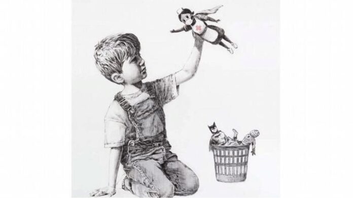 Ο πίνακας δείχνει ένα μικρό αγόρι να σηκώνει μια νοσοκόμα-κούκλα, με το χέρι τεντωμένο και φορώντας κάπα, ενώ παραδοσιακοί υπερήρωες όπως ο Μπάτμαν ή ο Σπάιντερμαν βρίσκονται στον καλάθι των αχρήστων.
