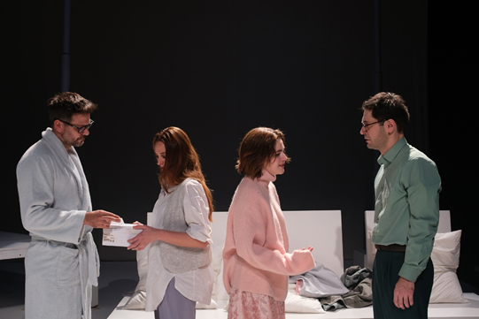 Οι τέσσερις ήρωες του έργου δείχνουν ανοιχτοί να έρθουν κοντά, πλησιάζοντας ο ένας τον άλλον ασφυκτικά, αχόρταγα, χωρίς καμία αναστολή. Μοιραία, μέσω του πλησιάσματος της σάρκας, θα εκφραστεί και το αιώνιο παράδοξο του έρωτα: όσο πιο κοντά θα πλησιάζουν ο ένας τον άλλον, τόσο πιο έντονα θα βιώνουν τις παγίδες, τα ρίσκα, τα συναισθηματικά κενά, τα αδιέξοδα, τις ματαιώσεις και το βαθύ ανικανοποίητο τού μαζί. Ο πόθος, η έλξη, η σεξουαλική ορμή, ο εθισμός, τα σκοτεινά πάθη, οι ανασφάλειες, η περηφάνεια, η ζήλια, η απόγνωση, η προδοσία, η προσποίηση, η εκδίκηση, τίποτα δε θα μείνει ανέγγιχτο σε αυτό το ερωτικό τετράγωνο, που παραμένει διαρκώς και με όλες τις πλευρές ανοιχτές.