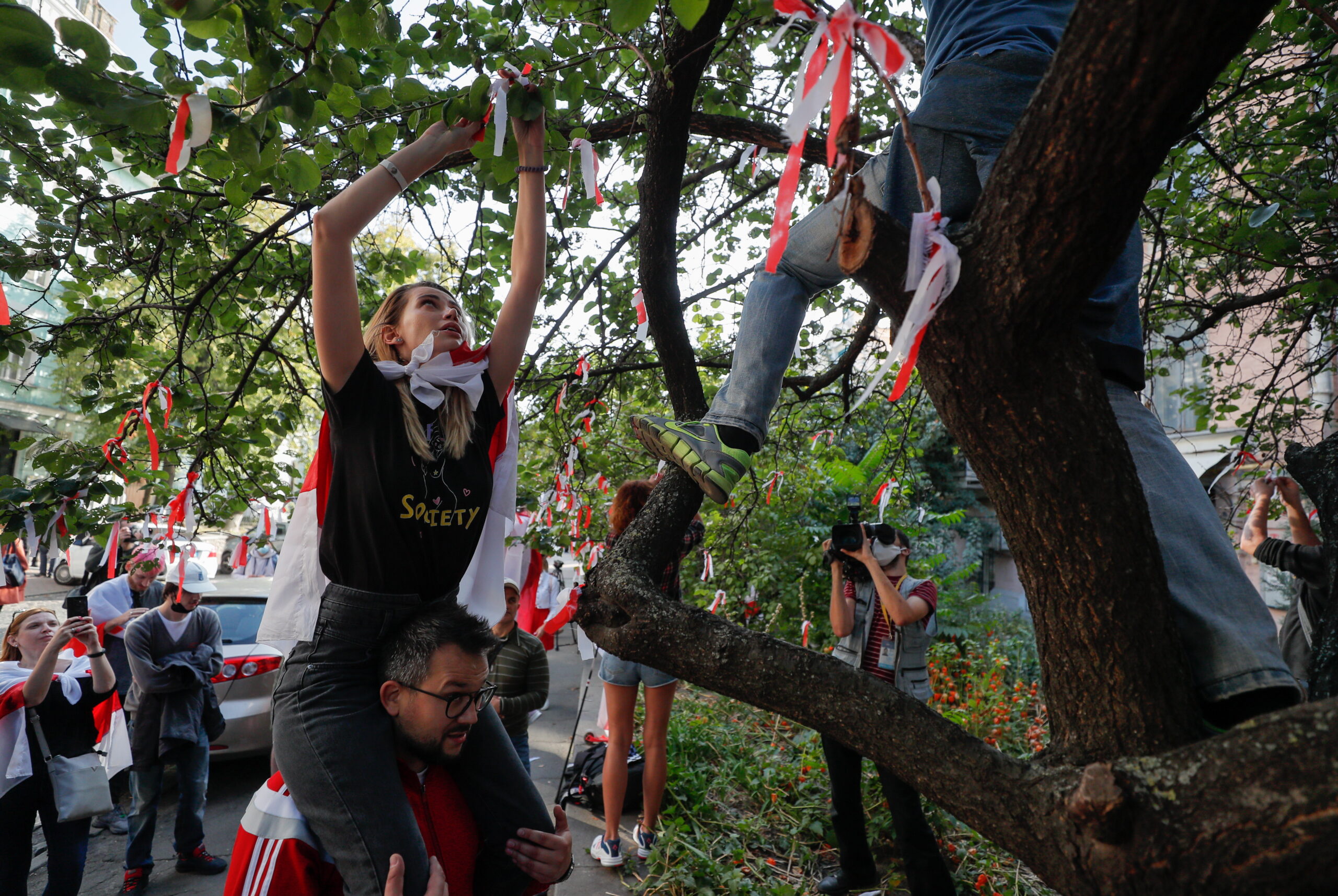 Σήμερα, οι διαδηλωτές έκαναν πορεία σε εορταστική ατμόσφαιρα κρατώντας λευκές και κόκκινες σημαίες και φωνάζοντας: «Ξεκουμπίσου», αλλά και συνθήματα κατά του προέδρου της Ρωσίας Βλαντίμιρ Πούτιν, υποστηρικτή του Λουκασένκο στην κρίση που συγκλονίζει την Λευκορωσία εδώ και δυόμισι μήνες.