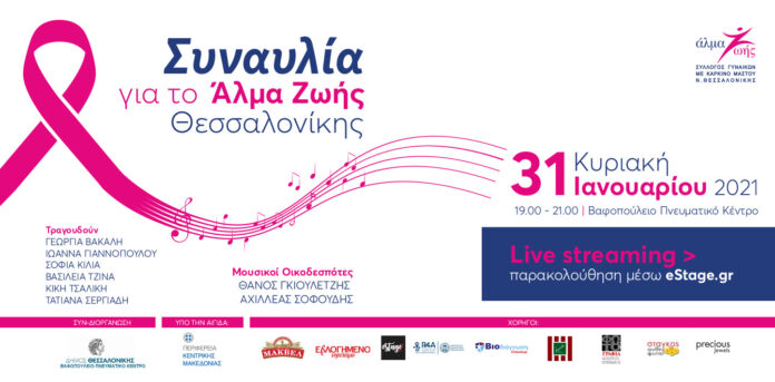 Διαδικτυακή συναυλία διοργανώνει ο Σύλλογος Γυναικών με Καρκίνο Μαστού «Άλμα Ζωής» Ν. Θεσσαλονίκης, σε συνεργασία με το Βαφοπούλειο Πνευματικό Κέντρο Δήμου Θεσσαλονίκης και υπό την Αιγίδα της Περιφέρειας Κεντρική Μακεδονίας.