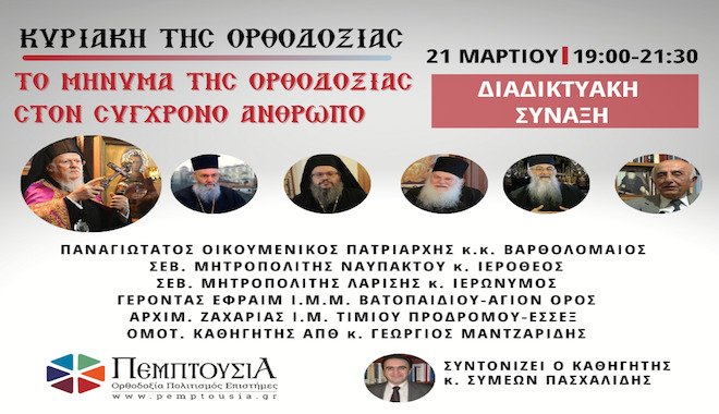 Με αφορμή την εορτή της Κυριακής της Ορθοδοξίας, την Α´ Κυριακή των Νηστειών, το Ινστιτούτο Άγιος Μάξιμος ο Γραικός και η Πεμπτουσία διοργανώνουν Διαδικτυακή Θεολογική Σύναξη την Κυριακή 21 Μαρτίου, στις 7 μ.μ., κατά την οποία ο πνευματικός ηγέτης της Οικουμενικής Ορθοδοξίας, ο Οικουμενικός Πατριάρχης κ.κ. Βαρθολομαίος, ο Σεβ. Μητροπολίτης Ναυπάκτου και Αγίου Βλασίου κ. Ιερόθεος, ο Σεβ. Μητροπολίτης Λαρίσης κ. Ιερώνυμος, ο Γέροντας Εφραίμ Ηγούμενος της Ι. Μ. Μ. Βατοπαιδίου Αγίου Όρους, ο Αρχιμανδρίτης Ζαχαρίας της Ιεράς Μονής Τιμίου Προδρόμου Έσσεξ Αγγλίας, ο Ομότιμος Καθηγητής ΑΠΘ κ. Γεώργιος Μαντζαρίδης και ο Καθηγητής ΑΠΘ κ. Συμεών Πασχαλίδης, εμβαθύνουν στο θεολογικό περιεχόμενο της εορτής και εστιάζουν στον θεραπευτικό χαρακτήρα της Ορθοδοξίας για τον σύγχρονο άνθρωπο, μέσα από το σωστικό έργο της Ορθόδοξης Εκκλησίας.