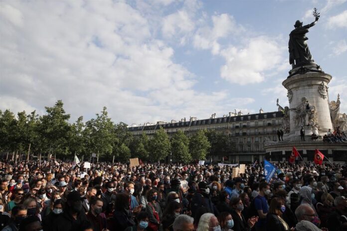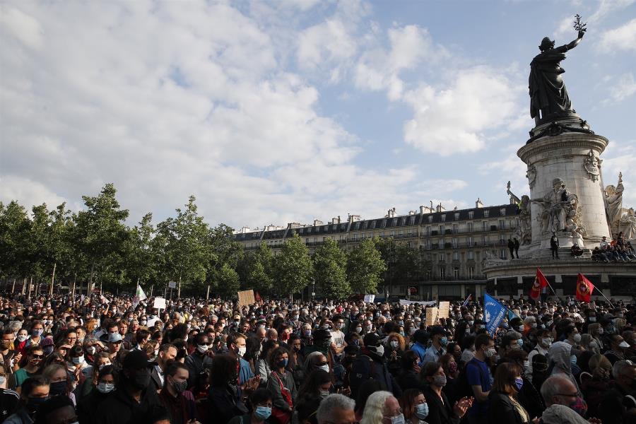 Κρατώντας πλακάτ με συνθήματα όπως «Σταματήστε την αστυνομική βία», «Σταματήστε τον ρατσισμό» και «Δεν μπορώ να αναπνεύσω», τις τελευταίες λέξεις του Φλόιντ προτού χάσει τις αισθήσεις του, οι διαδηλωτές έσκυψαν τα κεφάλια τους κάτω από το άγαλμα της Μαριάν, που προσωποποιεί τη Γαλλική Δημοκρατία, στην Πλας ντε λα Ρεπουμπλίκ.
