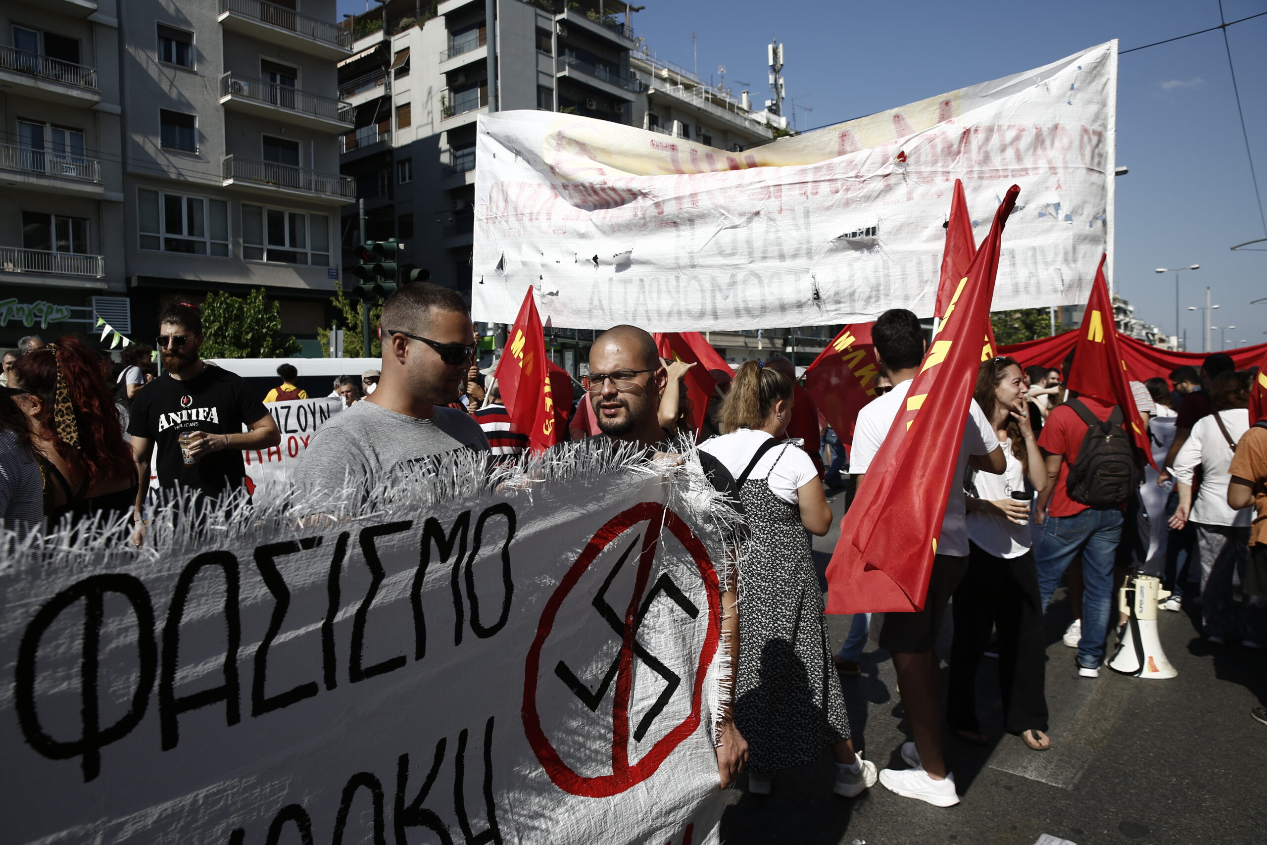 Με κεντρικό σύνθημα τη φράση «ποτέ ξανά φασισμός», οι συγκεντρωμένοι καταλαμβάνουν την κάθοδο της λεωφόρου Αλεξάνδρας ενώ περιμετρικά του Εφετείου βρίσκονται αστυνομικές δυνάμεις.