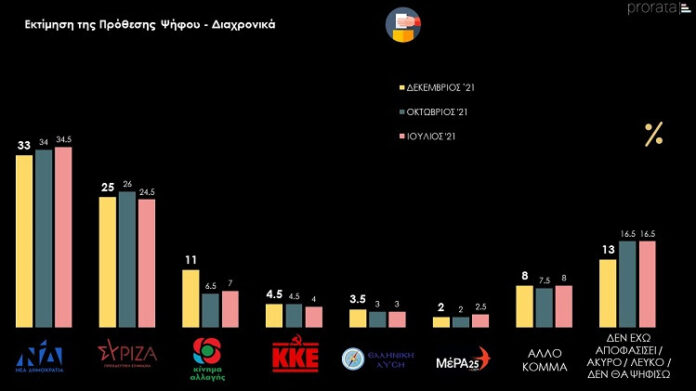Η Νέα Δημοκρατία (33%) και ο ΣΥΡΙΖΑ (25%) παρουσιάζουν οριακές απώλειες της τάξης του 1% συγκριτικά με την μέτρηση του Οκτωβρίου, διατηρώντας την μεταξύ τους απόσταση 8%. Αντίστοιχα, οριακές μόνο μεταβολές ανιχνεύονται ως προς την επιρροή του ΚΚΕ (4,5%), της Ελληνικής Λύσης (3,5%) και του ΜέΡΑ25 (2%).