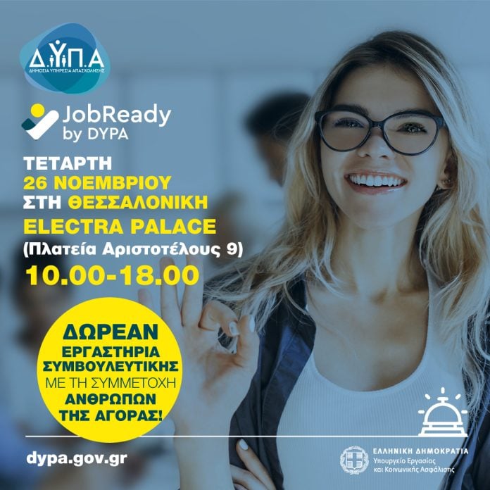 Την εκδήλωση JobReady by DYPA, μια ολοκληρωμένη δράση ενδυνάμωσης και προετοιμασίας για την αγορά εργασίας, διοργανώνει για δεύτερη φορά στη Θεσσαλονίκη η Δημόσια Υπηρεσία Απασχόλησης (ΔΥΠΑ), την Τετάρτη 26 Νοεμβρίου, από τις 10:00 έως τις 18:00, στο ξενοδοχείο Electra Palace Thessaloniki (Αριστοτέλους 9).