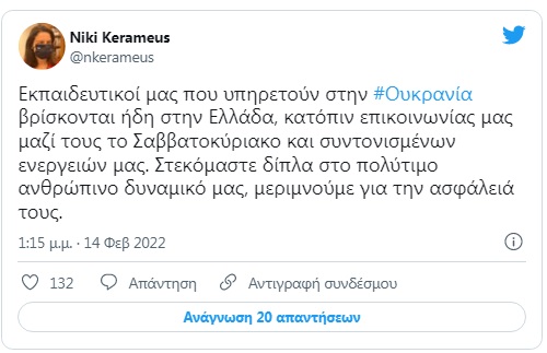 Οι Έλληνες εκπαιδευτικοί που υπηρετούν στην Ουκρανία έχουν επιστρέψει στην Ελλάδα, ενημέρωσε η υπουργός Παιδείας, Νίκη Κεραμέως, σε ανάρτησή της στο twitter.