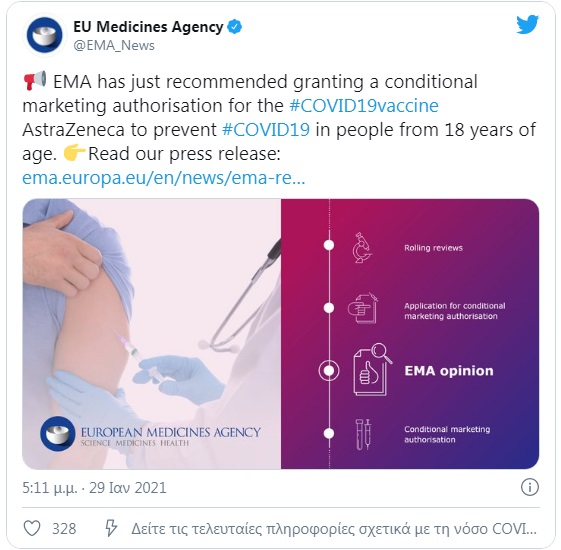 Για τη διάθεση του εμβολίου στην ευρωπαϊκή αγορά αναμένεται τώρα η τελική έγκριση από την Ευρωπαϊκή Επιτροπή, η οποία θεωρείται ζήτημα ωρών.