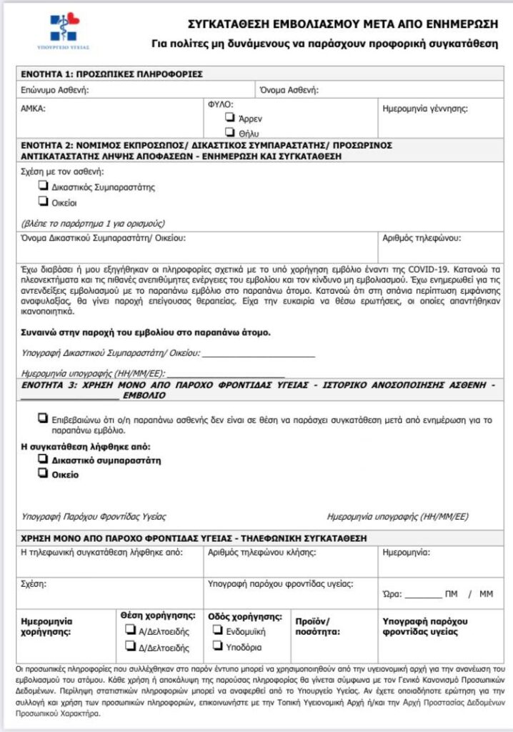 Στην περίπτωση που κάποιος πολίτης δεν μπορεί να παράσχει προφορική συγκατάθεση για το εμβόλιο, θα πρέπει να συμπληρώνεται το έγγραφο από κάποιον οικείο, πάροχο φροντίδας ή δικαστικό συμπαραστάτη.