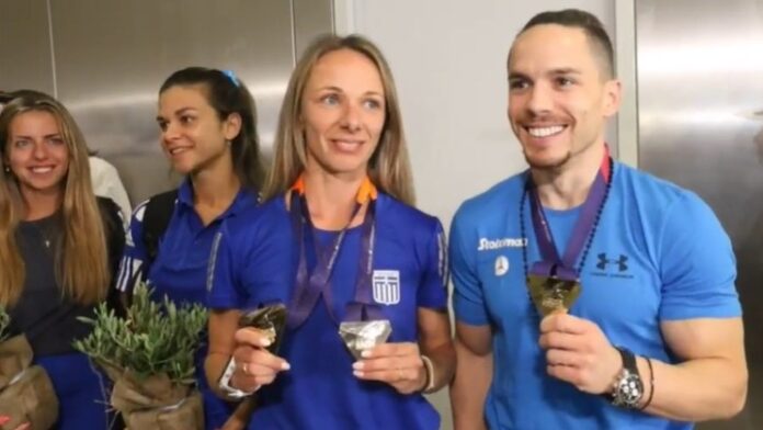 Με τα χρυσά μετάλλια κρεμασμένα στο στήθος εμφανίστηκαν στην αίθουσα των αφίξεων του «Ελευθέριος Βενιζέλος», η Αντιγόνη Ντρισμπιώτη και ο Λευτέρης Πετρούνιας, αρτιαφιχθέντες από το Μόναχο.
