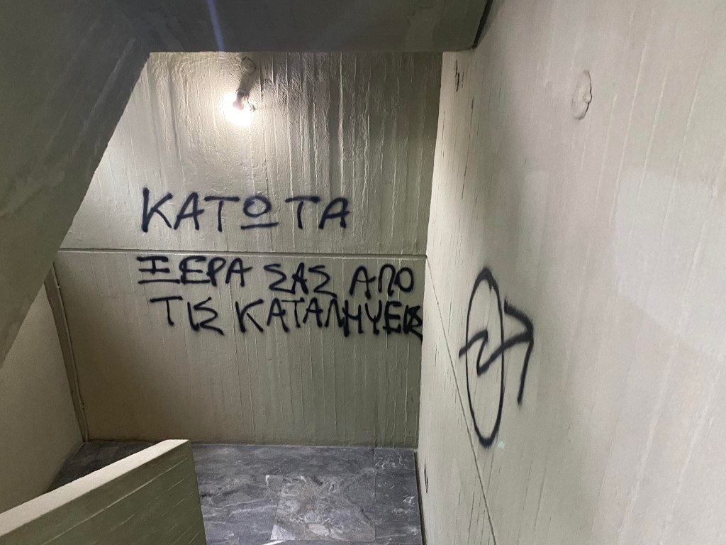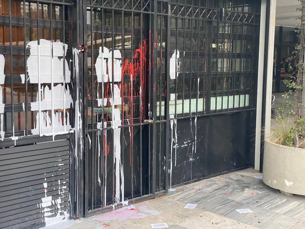 Από το ισόγειο έως τον 6ο όροφο του κτιρίου, πέταξαν μπογιές και έγραψαν συνθήματα -ως επί το πλείστον υπέρ των καταλήψεων. Επιπλέον, ανάρτησαν στην πρόσοψη του κτιρίου πανό και πέταξαν τρικάκια με συνθήματα αλληλεγγύης σε καταλήψεις.