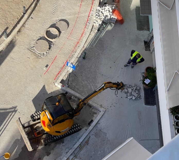 Όπως δείχνουν οι φωτογραφίες που μας έστειλε αναγνώστης μας, το πρωί της Δευτέρας, συνεργείο του ΔΕΔΔΥΕ βρέθηκε στο «πέταλο» των οδών Βύρωνος και Γρηγορίου Παλαμα, ξεκινώντας έργα για να περάσει καλώδια. Για τη συγκεκριμένη εργασία ωστόσο χρειάστηκε να σπάσει το τσιμέντο κατά μήκος της Γ. Παλαμά, το οποίο έριξαν τα συνεργεία του Δήμου Θεσσαλονίκης την Παρασκευή, στο πλαίσιο εργασιών ανάπλασης που είναι σε εξέλιξη στην περιοχή.