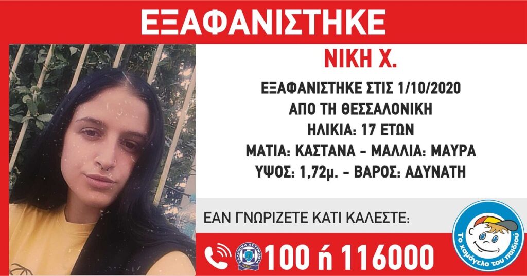 Από την 1η Οκτωβρίου αγνοείται μία 17χρονη κοπέλα από τη Θεσσαλονίκη.