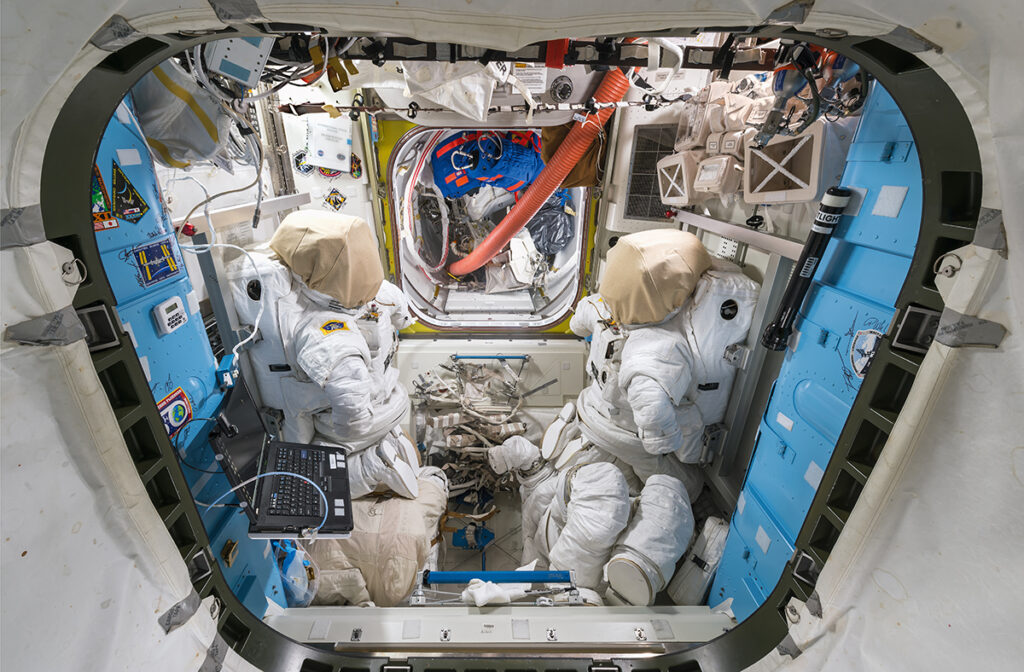 Οι δυο τους τράβηξαν καταπληκτικές φωτογραφίες: έναν ωκεανό με πέπλο από σύννεφα, τους λαβυρίνθους καλωδίων που είναι «στρίφωμα» στα εσωτερικά τοιχώματα του σταθμού, στολές και κράνη των αστροναυτών αφημένα σε σημεία για να χρησιμοποιηθούν.