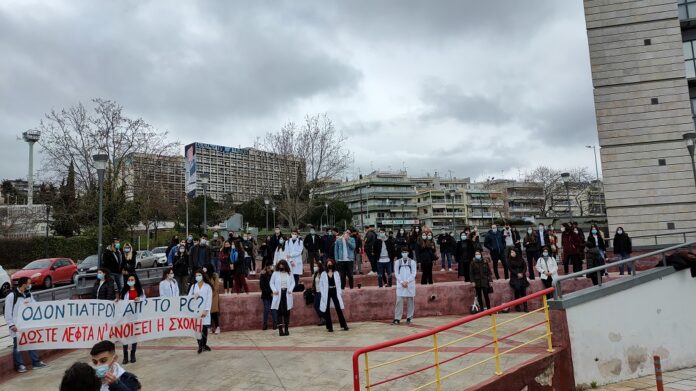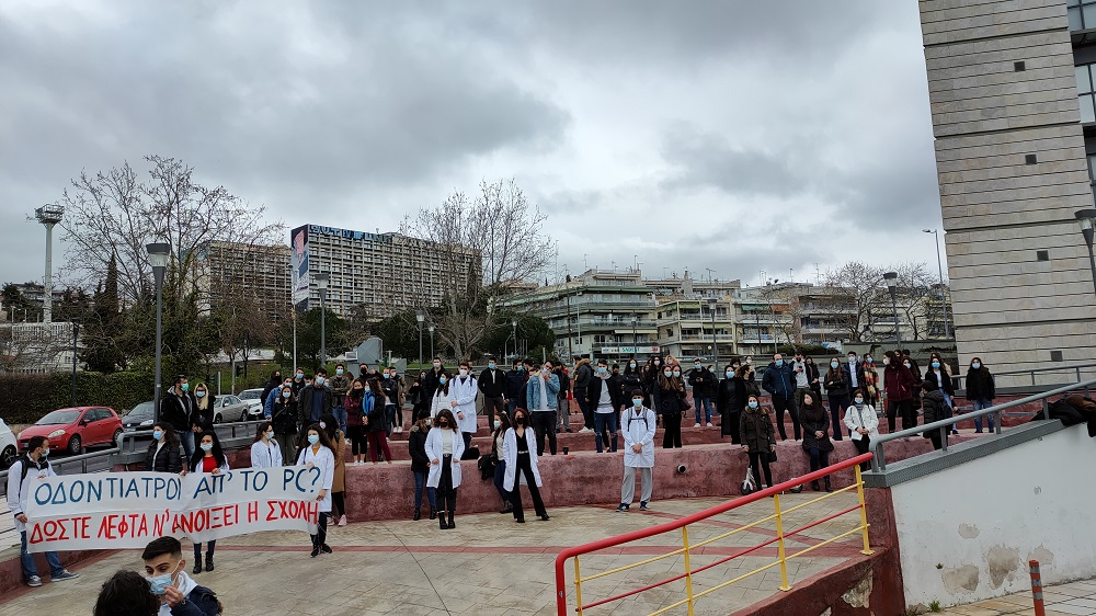 Οι φοιτητές του Τμήματος Οδοντιατρικής του Αριστοτέλειου Πανεπιστημίου Θεσσαλονίκης (ΑΠΘ) προχώρησαν σε κινητοποίηση διεκδικώντας την επαναλειτουργία των κλινικών του Τμήματος.