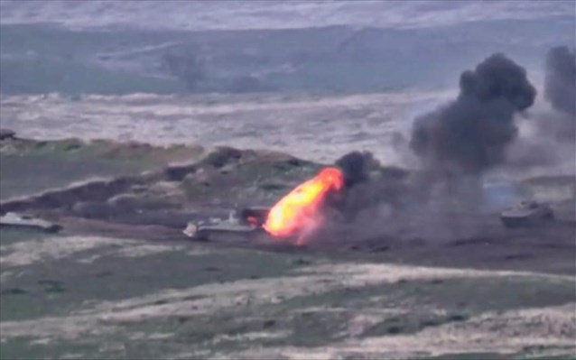 Σε ένα βίντεο που δόθηκε στη δημοσιότητα από το Γερεβάν, φαίνονται δύο αζέρικα άρματα που δέχονται πυρά και υψώνεται πυκνός καπνός, δίπλα σε τρία άλλα άρματα.
