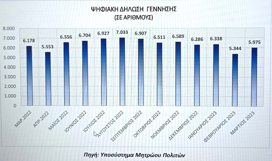 Στο γράφημα (εικ. 1) φαίνονται οι ψηφιακές δηλώσεις γέννησης κατά το χρονικό διάστημα Μαρτίου 2022 – Μαρτίου 2023.