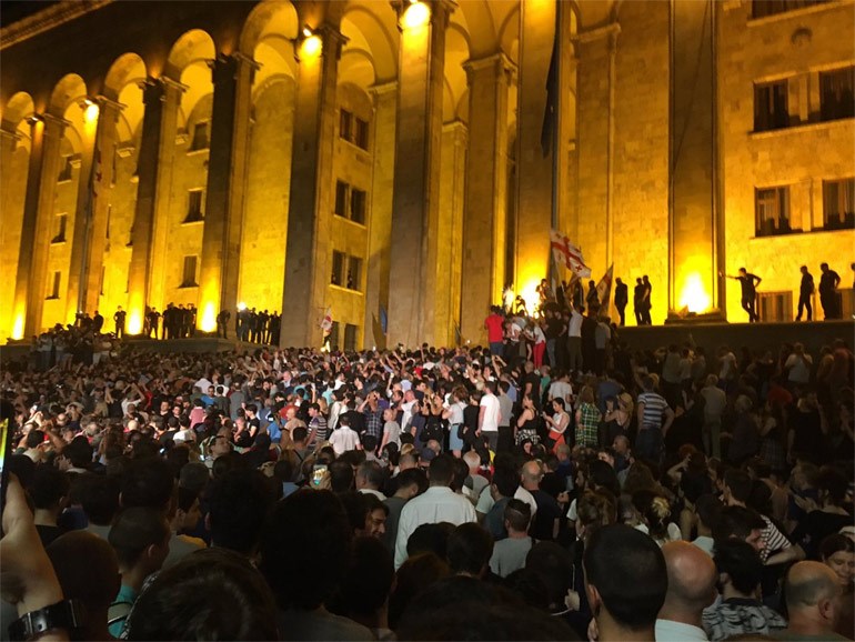 Αργά το απόγευμα σήμερα εκατοντάδες δημοσιογράφοι και ακτιβιστές για τα ανθρώπινα δικαιώματα διαδήλωσαν έξω από το κοινοβούλιο ζητώντας την παραίτηση του πρωθυπουργού Ιρακλί Γκαριμπασβίλι. Νωρίτερα, πολλοί βουλευτές της αντιπολίτευσης κατέλαβαν την έδρα του προέδρου του κοινοβουλίου απαιτώντας να παραιτηθεί ο Γκαριμπασβίλι. Κατηγόρησαν επίσης το κυβερνών κόμμα «Γεωργιανό Όνειρο» ότι δεν εμπόδισε τις βιαιοπραγίες εναντίον των δημοσιογράφων.