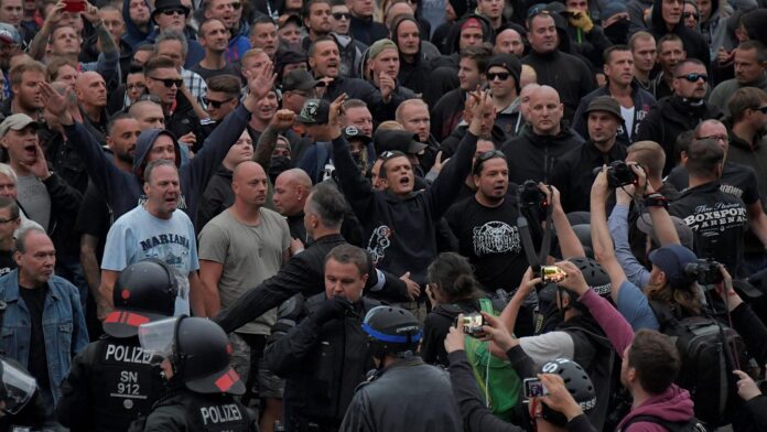 Νωρίτερα, ακροδεξιοί πέταξαν πέτρες εναντίον τρένου που μετέφερε ακτιβιστές της αριστεράς καθώς έφθανε στον σταθμό της Γκλάουχαου, ανέφεραν οι υπηρεσίες επιβολής της τάξης.