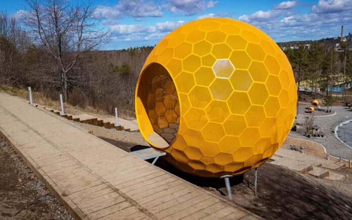 Στην κορυφή του λόφου κάθεται μια μεγάλη πορτοκαλί σφαίρα από διάτρητα εξαγωνικού σχήματος μεταλλικά φύλλα. Παιδιά και ενήλικες μπορούν να μπουν από το κυκλικό άνοιγμα για να ξεκουραστούν στους ξύλινους βαθμιδωτούς πάγκους στο εσωτερικό του. Όταν πέφτει ο ήλιος, η σφαίρα φωτίζεται από πολλά μικρά φώτα στο πάτωμά της ( https://www.instagram.com/p/CTLOMsGnz4a/ ).