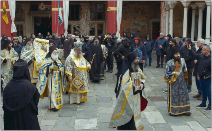 Μέσα σε κατανυκτικό κλίμα και σύμφωνα με την αγιορείτικη τάξη και παράδοση εορτάστηκε την Δευτέρα 19 Ιανουαρίου 2026 (06/01/26 π.ε.) η μεγάλη Δεσποτική εορτή των Θεοφανείων στην Ιερά Μεγίστη Μονή Βατοπαιδίου, χοροστατούντος του Επισκόπου Ευμενείας κ. Ειρηναίου, Ηγουμένου της Πατριαρχικής και Σταυροπηγιακής Ιεράς Μονής Κυρίας των Αγγέλων Γουβερνέτου Κρήτης, πλαισιούμενος από τον Καθηγούμενο της Ιεράς Μονής Γέροντα Εφραίμ και άλλους βατοπαιδινούς, αγιορείτες και επισκέπτες Πατέρες.