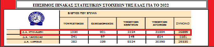 Επίσης σημειωνόταν ότι «εκείνο πάντως που εντυπωσιάζει από τα συγκεκριμένα δεδομένα της ΕΛ.ΑΣ. είναι ότι το 2022 οι συνολικοί έλεγχοι που πραγματοποιήθηκαν στα νησιά των Κυκλάδων ήταν 26.889 έναντι 30.760 το 2021 (δηλαδή κατά 13% λιγότεροι από μια χρονιά όπου υπήρχαν ακόμη περιορισμοί λόγω της πανδημίας). Ακόμη παρατίθεντο αναλυτικά στοιχεία για την εγκληματικότητα στα νησιά των Κυκλάδων.