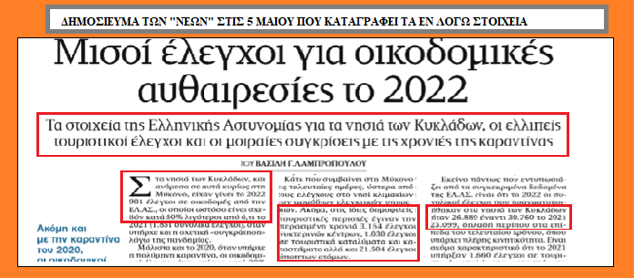 Στο δημοσίευμα αυτό μνημονεύονται σε τουλάχιστον 15 σημεία τα επίσημα στοιχεία της ΕΛ.ΑΣ. για τους οικοδομικούς , τουριστικούς ελέγχους κλπ την περίοδο 2020-2022 σε νησιά των Κυκλάδων κι ανάμεσα σε αυτά στην Μύκονο. Όπως σημειώνεται «στα νησιά των Κυκλάδων, και ανάμεσα σε αυτά κυρίως στη Μύκονο, είχαν γίνει το 2022 901 έλεγχοι σε οικοδομές από την ΕΛ.ΑΣ., οι οποίοι ωστόσο είναι σχεδόν κατά 50% λιγότεροι από ό,τι το 2021 (1.851 συνολικά έλεγχοι), όταν υπήρχε και η σχετική «συγκράτηση» λόγω της πανδημίας. Μάλιστα και το 2020, όταν υπήρχε η πολύμηνη καραντίνα, οι οικοδομικοί έλεγχοι ήταν επίσης κατά 30% περισσότεροι (1.688) σε σχέση με την τελευταία χρονιά».