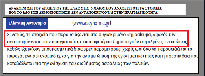Όμως ακολούθως προχωρά απολύτως δυσφημιστικά σε αναφορά «για στοιχεία που δεν ανταποκρίνονται στην πραγματικότητα» (!) Κι ενώ ( όπως παραθέτει αναλυτικά το in.gr ) στο δημοσίευμα περιέχονται μόνο τα στατιστικά στοιχεία της ΕΛ.ΑΣ. που καταγράφονται με ακρίβεια μονάδας . Κι η Αστυνομία σε επίσημη ανακοίνωση της δηλώνει τώρα «ότι αυτά τα στοιχεία δεν είναι αληθή».