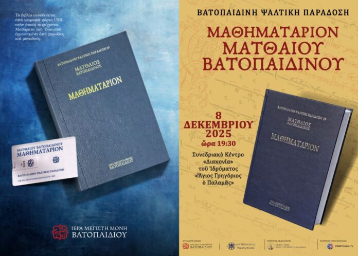 Η Ιερά Μεγίστη Μονή Βατοπαιδίου σε συνδιοργάνωση με την Ιερά Μητρόπολη Θεσσαλονίκης θα παρουσιάσουν το Μαθηματάριον του Μοναχού Ματθαίου του Βατοπαιδινού (1774-1849), μουσικού, κωδικογράφου, διδασκάλου της ψαλτικής τέχνης, σε εκδήλωση που θα πραγματοποιηθεί την Δευτέρα 8 Δεκεμβρίου 2025 και ώρα 7:30 μ.μ. στην Θεσσαλονίκη, στο Συνεδριακό Κέντρο «Διακονία» του Ιδρύματος «Άγιος Γρηγόριος ο Παλαμάς» (Ν. Πλαστήρα 65).