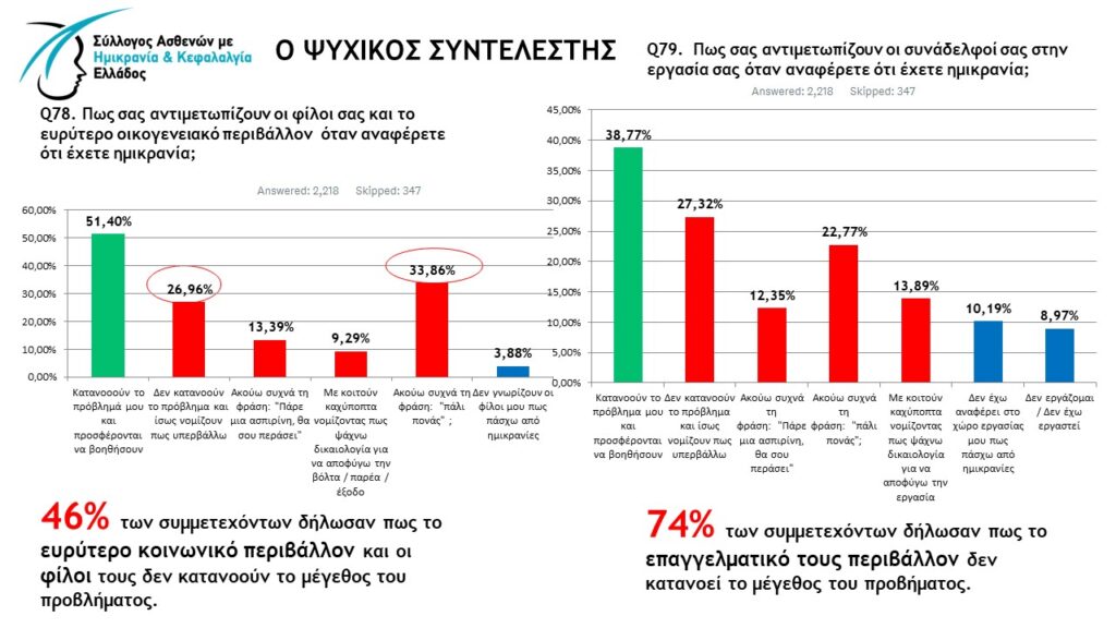 Αν και οι επιπτώσεις της ημικρανίας στη ζωή των ασθενών είναι τόσο μεγάλες, εννιά στους δέκα συμμετέχοντες πιστεύουν ότι το ευρύ κοινό δεν γνωρίζει/κατανοεί καλά ή δεν γνωρίζει καθόλου τι είναι οι ημικρανίες ως ασθένεια. Το 75% δηλώνει ότι τα μέλη της οικογένειάς του δεν κατανοούν το πρόβλημα, τους κοιτούν καχύποπτα ή λένε συχνά τη φράση «Πάλι πονάς;». Επίσης, το 74% αναφέρει πως το επαγγελματικό του περιβάλλον δεν κατανοεί το μέγεθος του προβλήματος, ενώ το 10% δεν έχει αναφέρει στο χώρο εργασίας του πως πάσχει από ημικρανίες. Μάλιστα, ένας στους πέντε αισθάνεται άβολα να πει σε διευθυντή ή προϊστάμενο ότι πάσχει από ημικρανίες και το 43% εκτιμά ότι η πάθηση επηρεάζει μερικές φορές, συχνά ή πάντα τον τρόπο με τον οποίο αξιολογείται από τον προϊστάμενο.