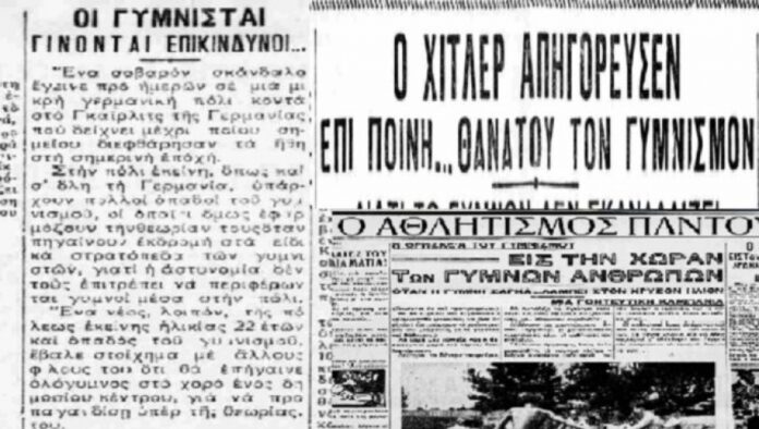 Στην Ελλάδα, μία πρώτη κίνηση γυμνιστών παρουσιάστηκε στον Μεσοπόλεμο, άλλα δεν εδραιώθηκε. Τότε οι οπαδοί του κυκλοφορήσαν για σύντομο χρονικό διάστημα κι ένα περιοδικό, με τίτλο «ΦΛΕΡΤ» (Φυσιολατρική Λογοτεχνική Επιθεώρηση Ριζοσπαστικών Τάσεων).