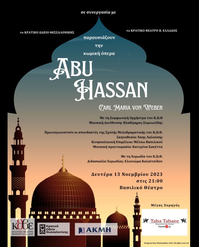 Την όπερα «Abu Hassan» του Carl Maria von Weber παρουσιάζει το Κρατικό Ωδείο Θεσσαλονίκης, τη Δευτέρα 13 Νοεμβρίου 2023, στις 21:00, στο Βασιλικό Θέατρο, στη Θεσσαλονίκη.