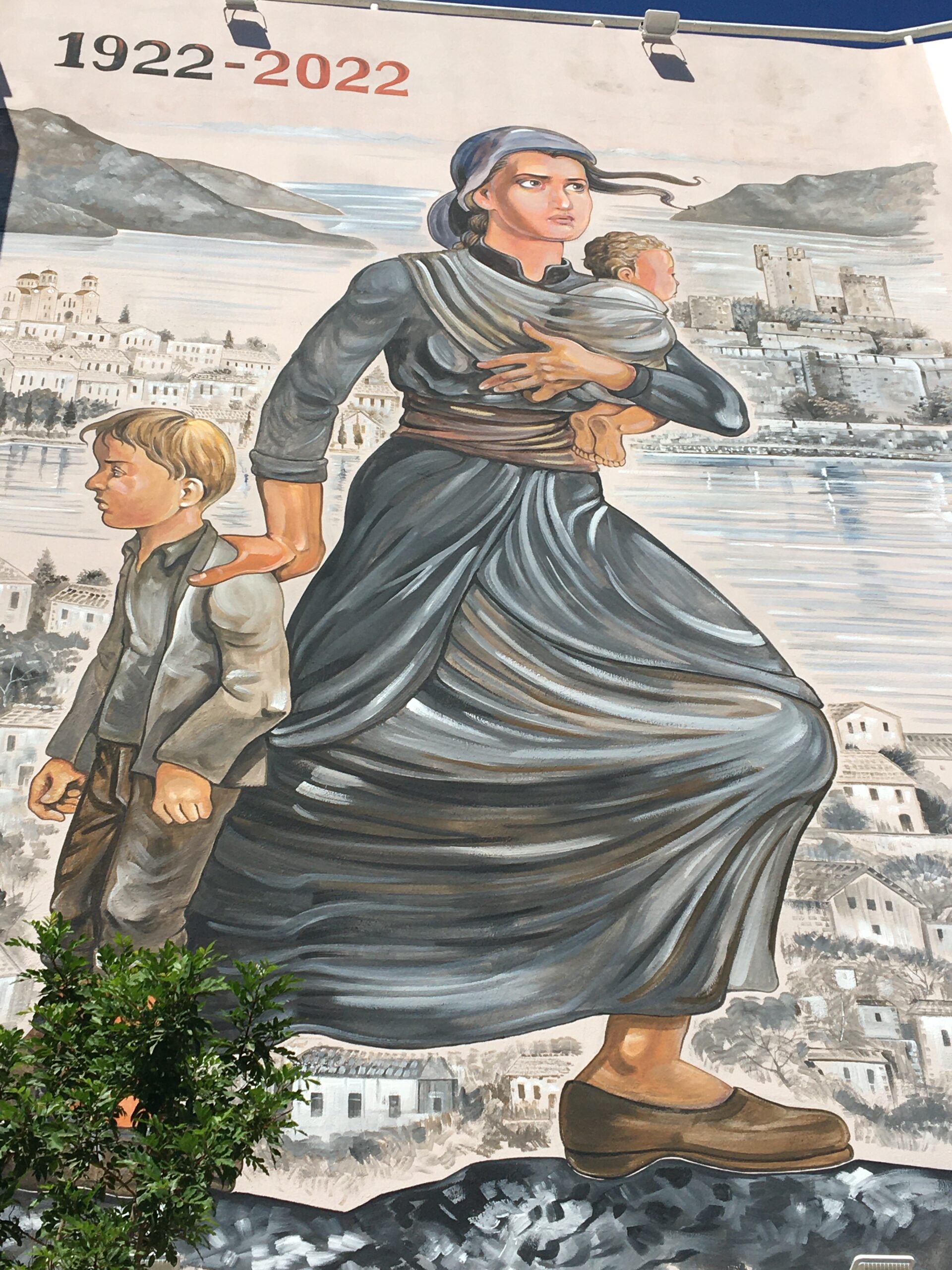 Το γκράφιτι απεικονίζει την μάνα Μικρασιάτισσα που έχει στην αγκαλιά της ένα παιδί και ακόμη ένα δίπλα της. Το βλέμμα της είναι θλιμμένο και φοβισμένο, παίρνοντας τον δρόμο της προσφυγιάς.